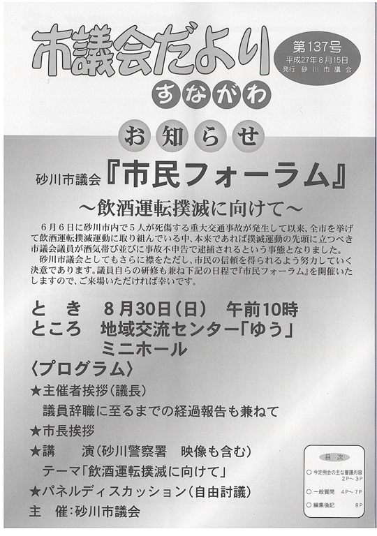 6月6日に砂川市内で5人が死傷する重大交通事故が起こり、全市を挙げて飲酒運動撲滅運動に取り組んでいた7月23日、星洋一元議員が酒気帯び並びに事故不申告で逮捕されるという考えられない事態を引き起こしました。