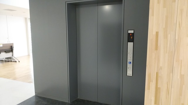 男子トイレとエレベーター。新しいからみんなスゴク見えます。たまたま、一緒にエレベーターに乗った女性が『かつては食缶だけ運ぶエレベーターはあったけど、人も乗れるのネー!』