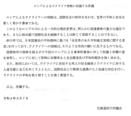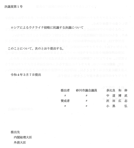 午前9時から議運が開かれ、緊急に「ロシアによるウクライナ侵略に抗議する決議について」を議会提案することを決定。全会一致で可決しました。