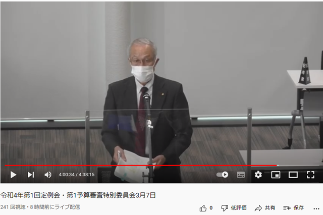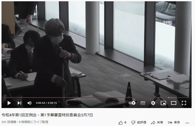 インターネット中継された内容が砂川市議会HPに編集されないで掲載されていますので「令和4年第1回定例会・第1予算審査特別委員会3月7日」にリンクします。