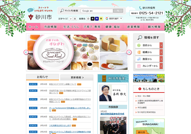 下の写真は砂川市のHPのトップ画面です。市長のブログが真正面にデザインされているのは他市町村のHPでもなかなかありません。