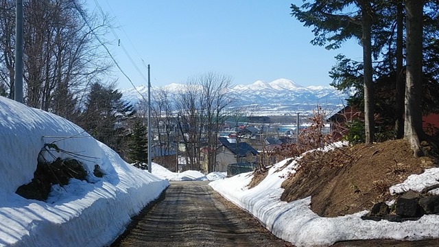 小高い場所からピンネを見ているので見える角度が違います。良い眺めでした。雪解けも進み、山側の道路も路面が出ています。私の車は夏タイヤで走っています。