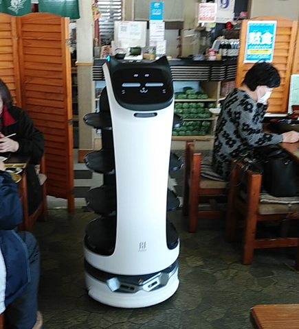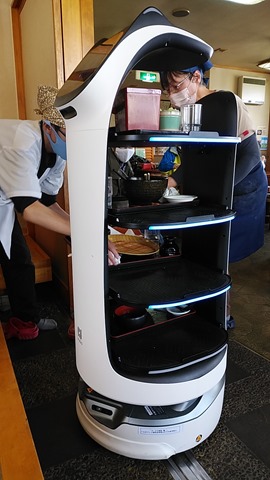 人手不足と新型コロナウイルス感染対策として経済産業省の補助金で導入したらしいですけど、上手に調理場と客席を行ったり来たりしていました。