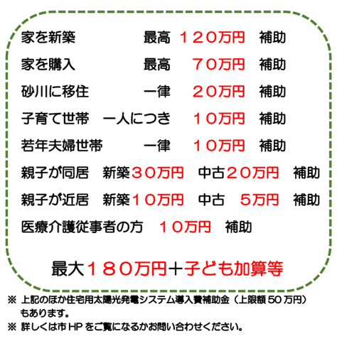 さらに、砂川市では子育て世帯にはこども一人につき10万円を進呈するなど、以下のような優遇措置もあります。