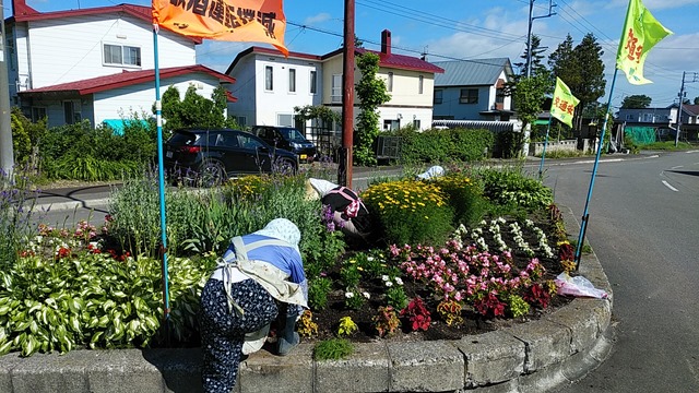 ロータリーの雑草取り。植えた花々も大きく育ってきました。