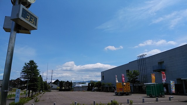 地域交流センター「ゆう」の温度計は33℃。キッチンカーが営業中ですが、その話は明日にでも。