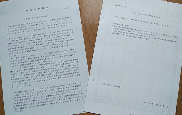 21日の臨時議会は「北海道電力砂川発電所の廃止について」の特別行政報告が市長からあります。(写真の左側)