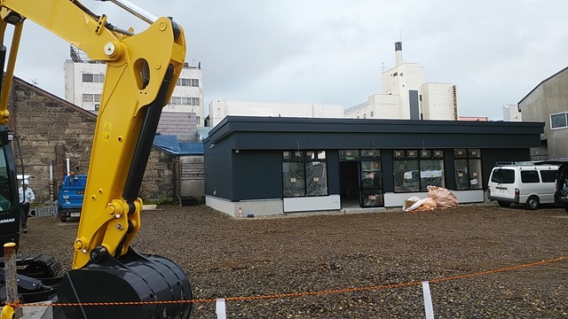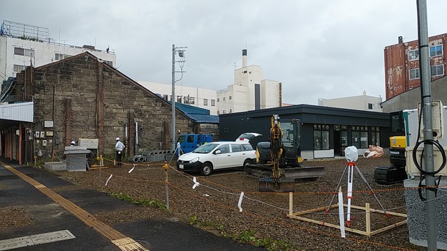 以前は築130年の中川かなものの建物があった場所。コンビニ風の建物の工事中でした。写真を見ると左奥の古い建物も気になります。石造りで歴史がありそうです。