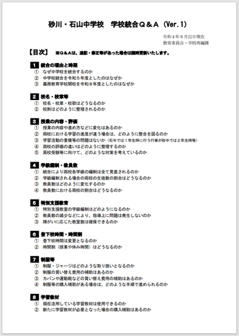 砂川市のHPに「砂川・石山中学校 学校統合Q&A(Ver.1)pdf」がUPされました。砂川中と石山中の統合は来年(令和5年)4月に迫っています。