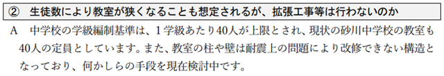 1学級40名のビッシリ状態です。新3年生は統合したばかりで落ち着かず、さらに受験も控えています。これも総務文教委員会で話していますが、何とかならないものかと思います。Q&Aの回答は以下の通り。