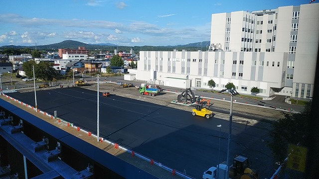 上の写真は、旧庁舎跡の駐車場整備の様子です。アスファルトが敷かれています。