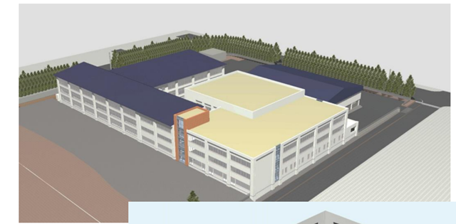 屋根の色が紺色の部分は改築。黄色の部分は新築した校舎です。このようにシンプルな校舎ですとこれも上手く行くのでしょうが、砂川中は複雑な校舎になっているので、どうなるでしょう。