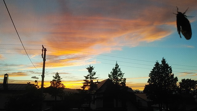 ところで、昨日の夕焼けはとてもキレイでした。我が家の2階から夕焼けを撮ったのですが、写り込んだのがアブラゼミ。