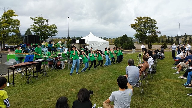 午前中のステージでは砂川中吹奏楽部の演奏。キツネダンスも飛び出して大盛り上がりでした。