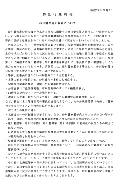 道警も住民説明会を行うと言っているので、その後の行動でも遅くないと思います。それにしても、本日の市長の答弁で驚いたのは、私が『統合に反対して今の砂川署の建物をどのようにしたいと要望するのか』の問いに対し、『砂川署の建物は北海道の物なので、私が関知したことではない。』と話しました。