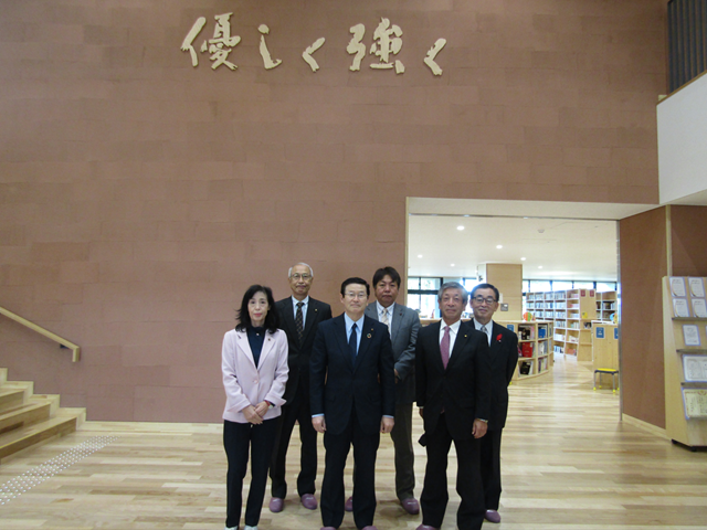 非常に残念ではありますが、仕方がありません。上の写真は総務文教委員と議長で、視察後に児童玄関前で撮ったものです。児童玄関を入るとすぐに図書コーナーでした。