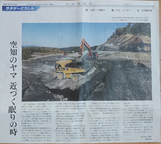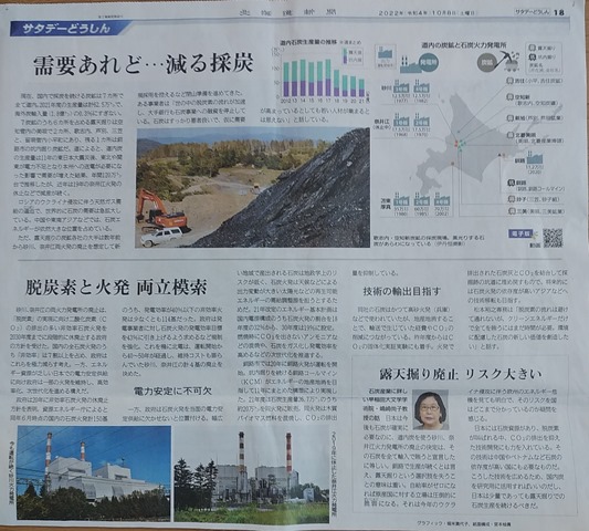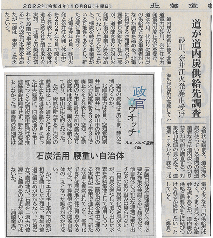 上の記事も道新です。10月8日の記事では北海道が空知管内の採炭事業者の調査をしたという内容。そして、10月15日付の記事(政官ウォッチ)は『石炭を「過去の資源」と諦めるのはまだ早いのではないか。』と記されています。