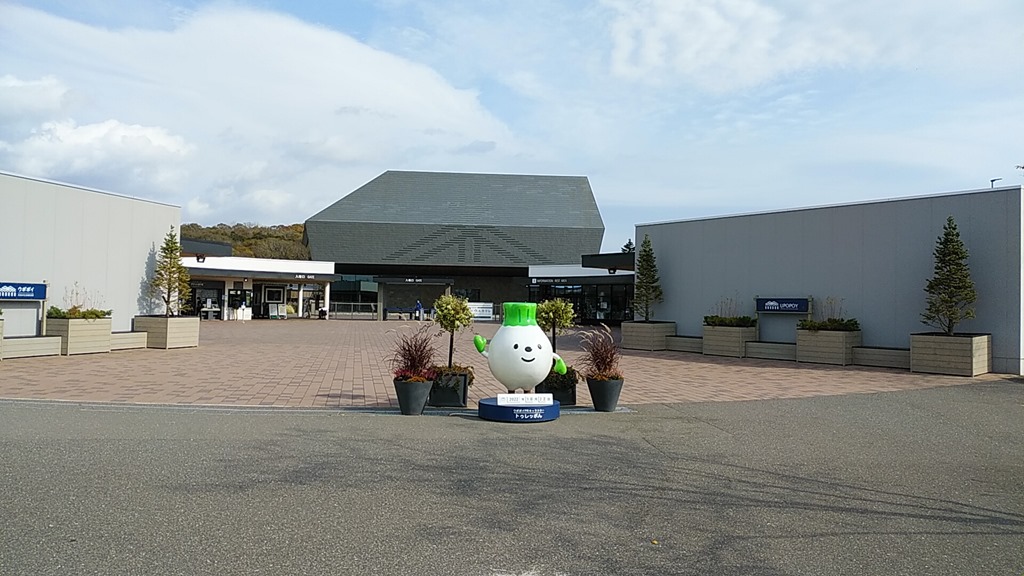 正面玄関です。玉ねぎのようなキャラクターはオオウバユリの根がイメージだそうです。