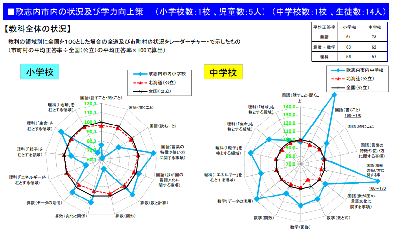 こちらの中学校の結果は凄いんじゃないですか。義務教育学校の成果でしょうか。テストを受けた児童・生徒数を見ると小学生5人、中学生14人でした。