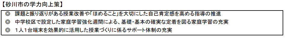 道教委の報告書に書かれた砂川市教育委員会の学力向上策は以下の通り。