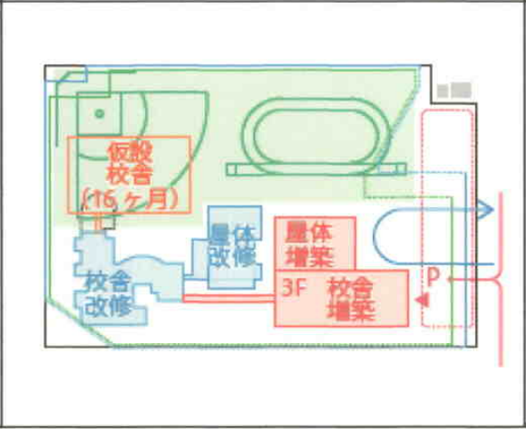 音楽堂を壊して道々側にできる増築校舎と長い渡り廊下で繋ぐ案。仮設校舎を建てます。