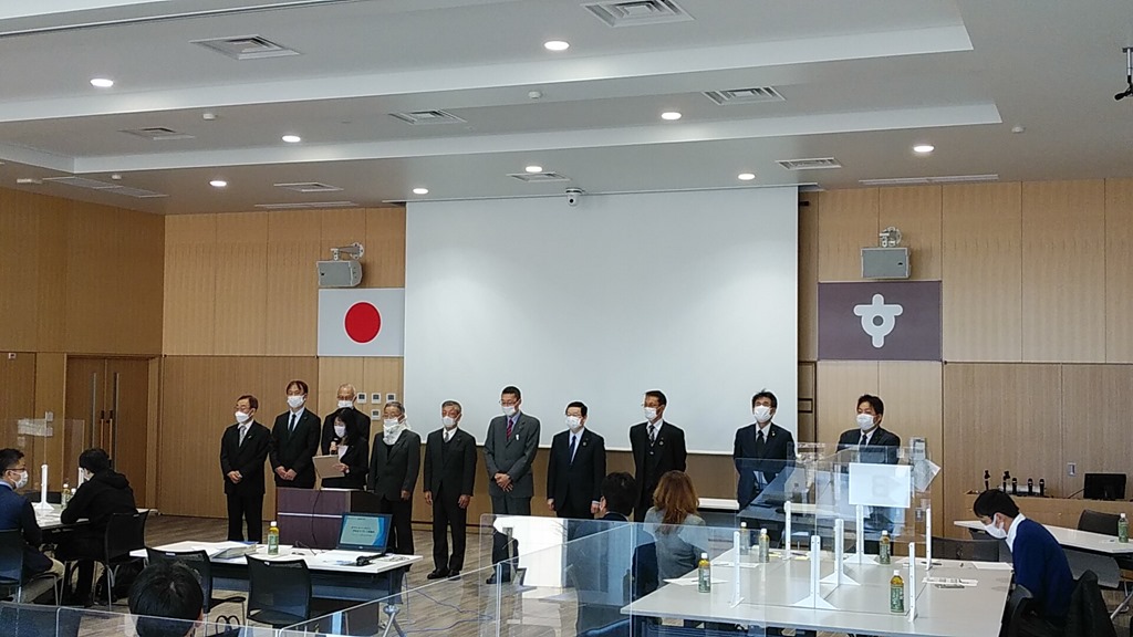 上の写真は最初に50音順に並んで議員紹介です。欠席は佐々木議員だけで11名。(条例定数は13名)