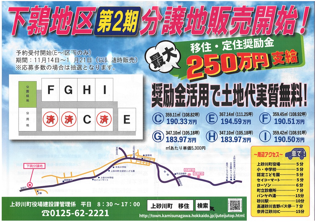 チラシの書き方が気になって・・・。車で砂川駅まで10分、高速砂川吉野バス停まで7分、奈井江砂川ICまで15分。土地代ただ!