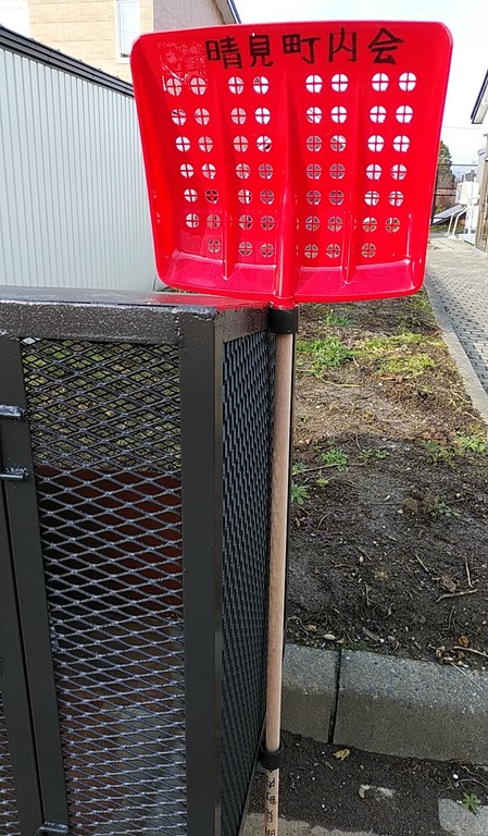 そこで考えたのが、上の写真です。ゴミ出しに来た時に除雪する道具が傍にあれば、ちょっと雪はねしていただけるのではないかと、まず一カ所から始めました。