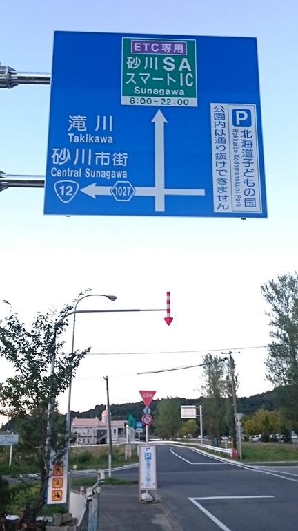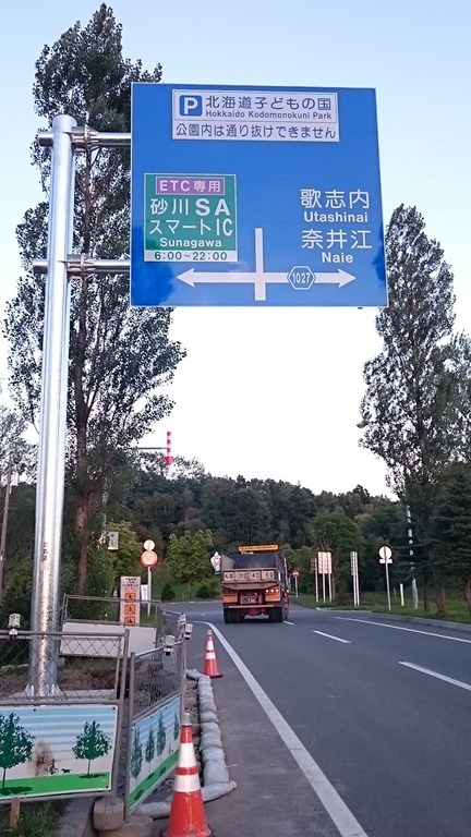 相当気になっていた「砂川SAスマートインターチェンジ」を表示する道路標識がやっと変わりました。8月8日にスマートインターが開通して以来、子どもの国の駐車場に行く車が手前で曲がってインターに向かう道路に侵入し、慌ててUターンする場面を何度も見ていました。