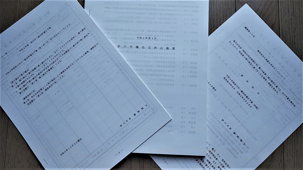 左は補正予算書、真ん中は条例の一部改正などの議案書、右は専決処分した補正予算書です。