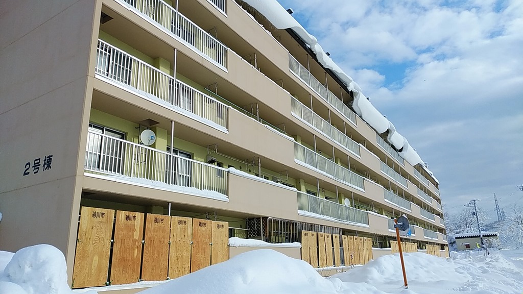 回っている途中の市営住宅「東町団地」。一階は屋根からの落雪予防のコンパネが設置されています。窓が囲われて暗いのではないかと思われますが、間が空いているので思うほどではないそうで、評判もまずまずのようです。