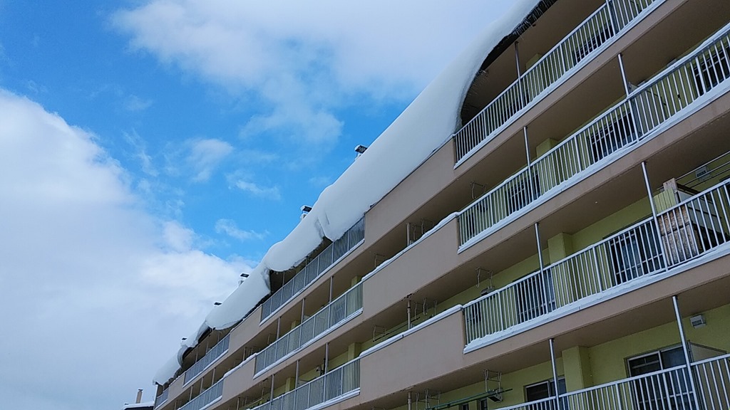 ただ、暖気で屋根から垂れ下がった雪庇がベランダに入り込んでいました。一度に積もった雪は量も多く、暖気になりそうなので危険です。