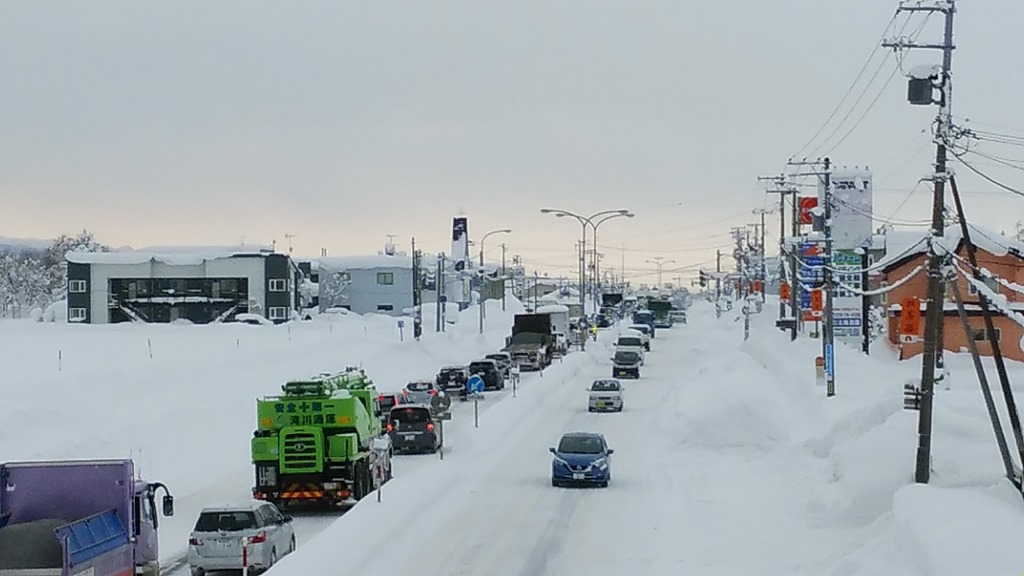 本日は吹雪も止み、本格的な街回り日和でしたが、高速道路が通行止めになっているのでしょうか。上の写真のように国道12号線は渋滞が続いていました。