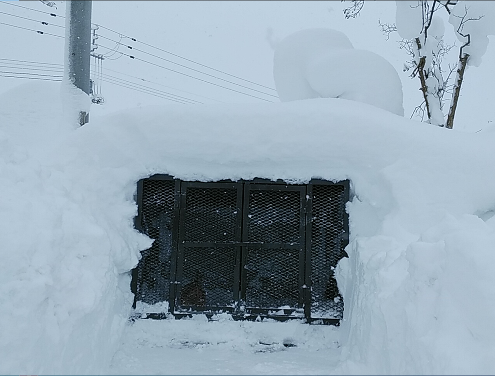 我が家の班のゴミステーションが早朝除雪後の重たい大量の雪で埋まっています。(上の写真)