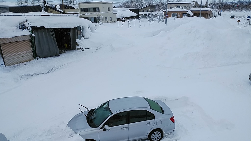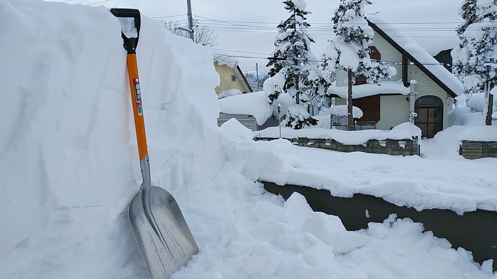 いやー、ずいぶん溜まっていました。積雪量1m08cmです。上の雪は軽いのですが、下に行くとびっしりと詰まって重たい雪。何だかんだで午前中いっぱい不慣れな重労働でした。