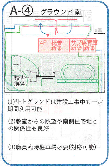 校舎、グランドの位置関係は上のイラストが一番との説明です。もちろん、具体的には基本設計で見えてきます。