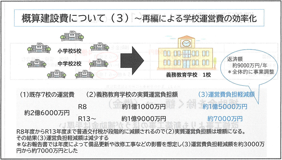 そして、小学校5校と中学校2校を義務教育学校1校にするので学校運営の経費が削減されるのが、年間3,000万円~7,000万円(ちょっと幅が大きいですが)。
