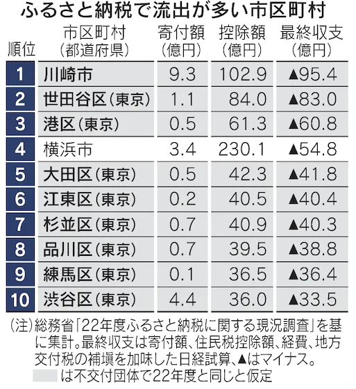 上の表は記事中にある流出超過の自治体。都会では地方の自治体にふるさと納税をする方が多く、寄附額より控除額が上回っているのだそうです。
