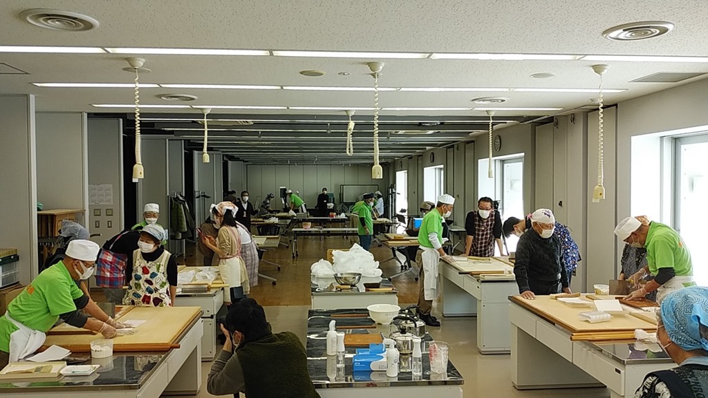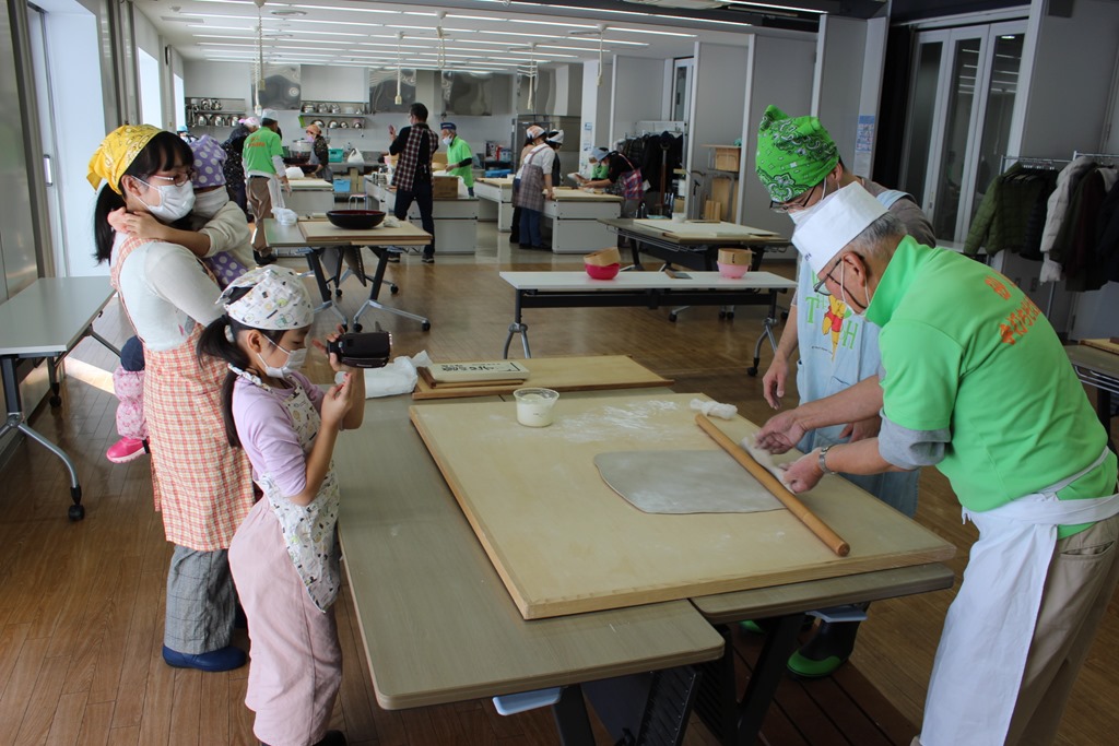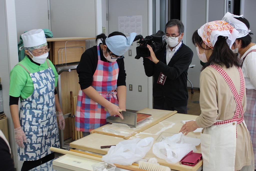 手打ちそばは切るのが難しい。この組の皆さんは包丁の持ち方も良く、おいしいおそばができそうです。