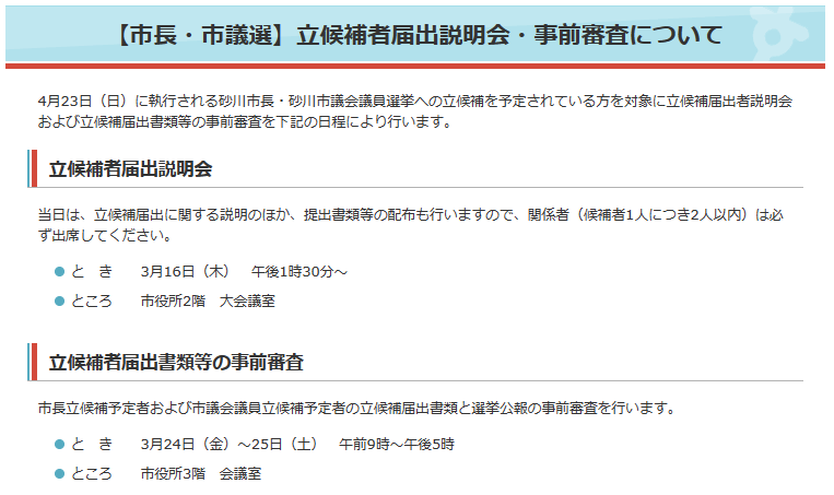 砂川市のHPに「立候補届出説明会」のお知らせが掲載されました。