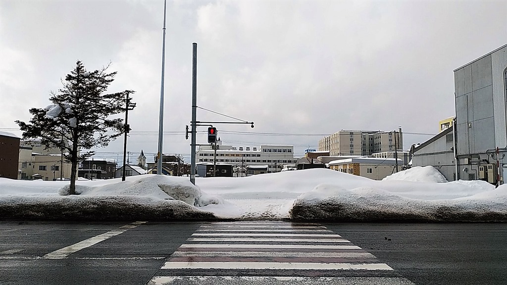 上は北洋銀行前の横断歩道を信号待ちしていました。パチンコ屋さんの建物も解体作業中の塀もなくなって市立病院やオアシスパークの電波塔が見えます。