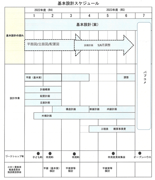 現在、1回目の市民ワークショップが終わった段階の基本設計のスケジュールが示されました。