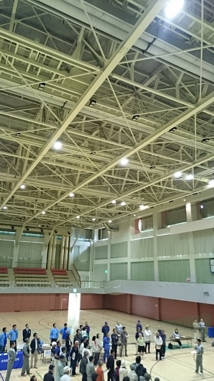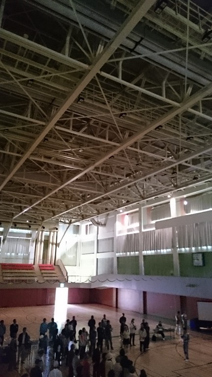 天井の照明の3分の1が点灯します。少し暗くはありますが、避難所としては十分な明るさが確保されているのが分かります。この自家発電装置は1週間は継続できるとのこと。11時過ぎには災害訓練は終了しました。