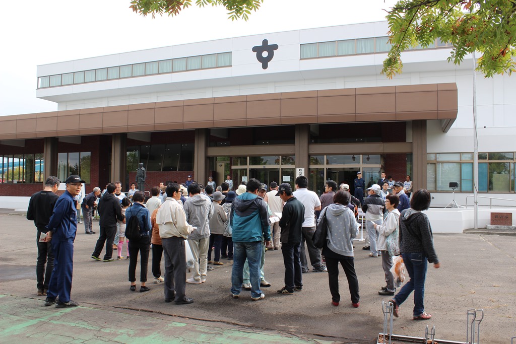 本日、午前8時50分に砂川市に災害が発生したとの想定で防災訓練が総合体育館で行われました。総合体育館を避難所としている6町内会の皆さんが集まりました。まずはバケツリレーによる消火訓練です。