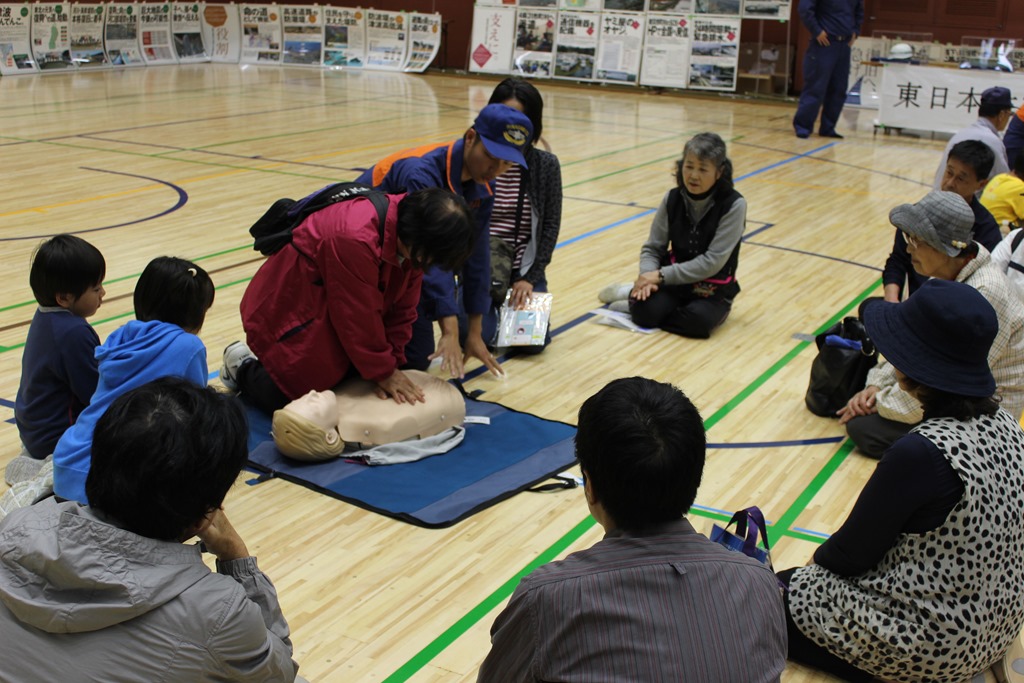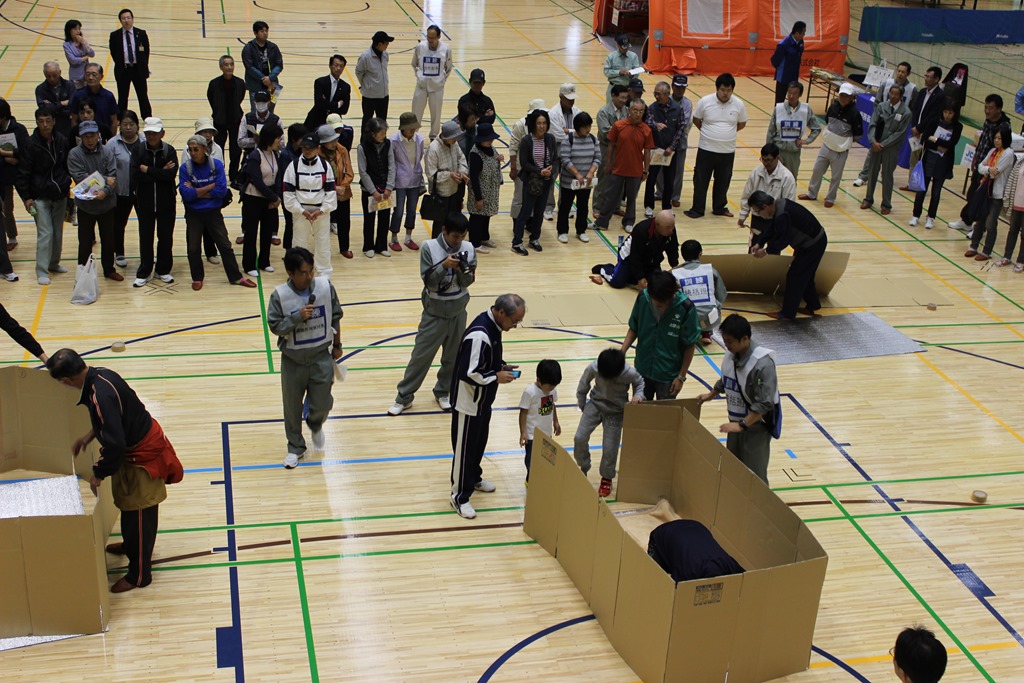 続いて、場所は総合体育館の中に移動。救急訓練として、AEDを使った心肺蘇生法の訓練、段ボールを活用し、仕切りなどの作成方法を学ぶ簡易居場所づくり訓練。