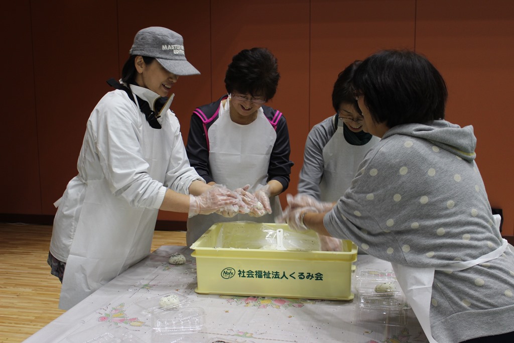 左の写真は住民による炊き出し訓練で参加者がおにぎりを作っているところです。