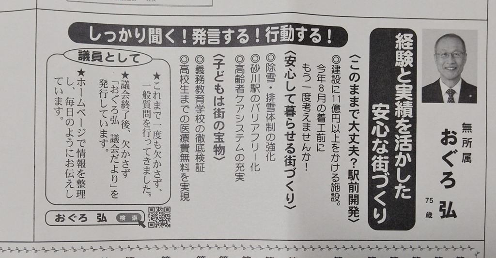 昨日、選挙公報が配られました。砂川市議選に立候補した15人の政策が書かれています。