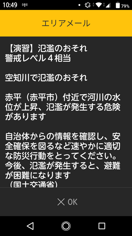 昨日(3日)の私のスマホに届いたエリアメールです。落ち着いて見れば一番上の「氾濫のおそれ」の前に【演習】と書いてありましたが、昨日は全く【演習】を見落としていました。