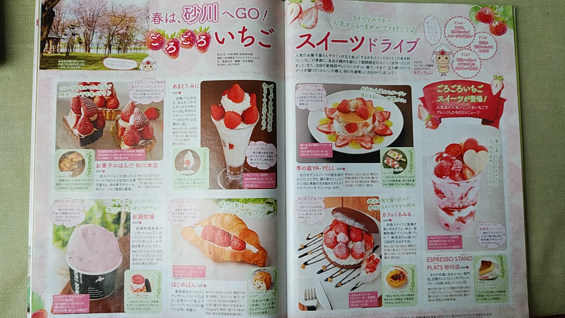 いちごスイーツ特集で、「PLATS」、「ヤ・エール」、「くるみる」、「あまとうみに」、「ほんだ」、「岩瀬牧場」、「はじめぱん」が掲載。まだまだ砂川スイートロードにはたくさんあると思います。