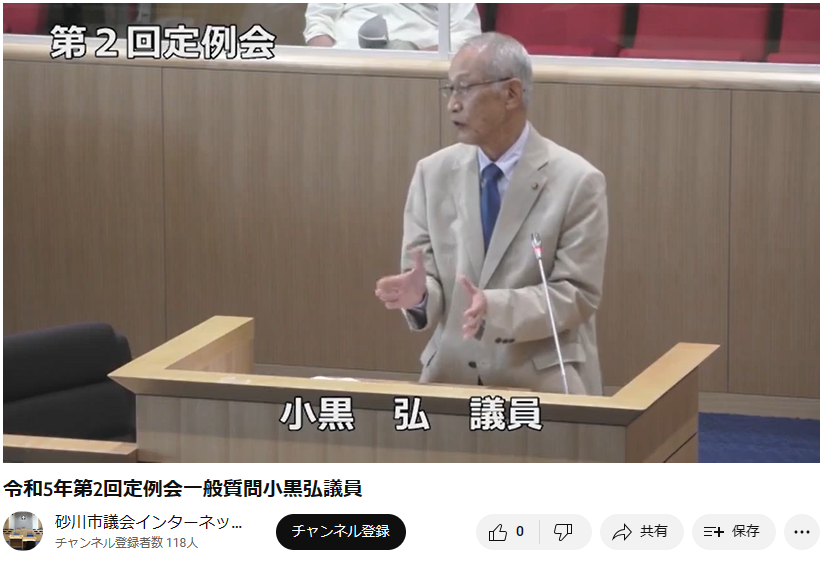 砂川市議会のHP「令和5年第2回定例会一般質問小黒弘議員」にリンクしますのでご覧ください。
